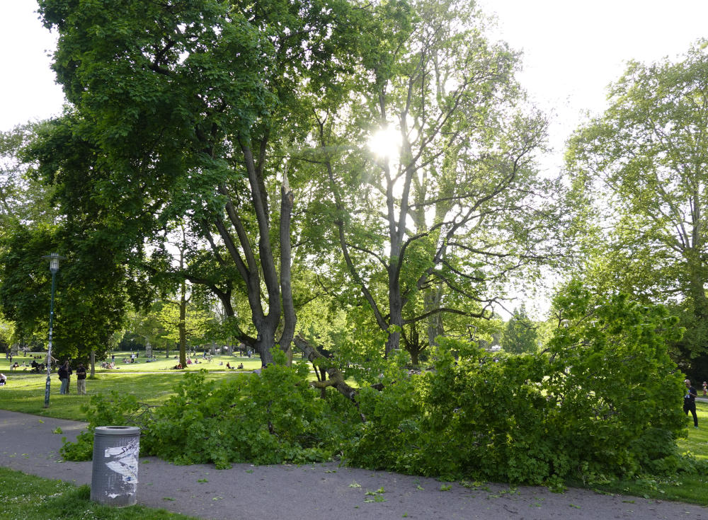 Zeitgleich zur Eröffnungsrede von Michael Kolmer, in der auf die aktuelle Trockenheit in diesem Frühjahr hingewiesen wird, bricht nebenan im Herrngarten ein massiver Ast eines Ahornbaumes ab. Wundersamer Weise saß genau dort gerade niemand.